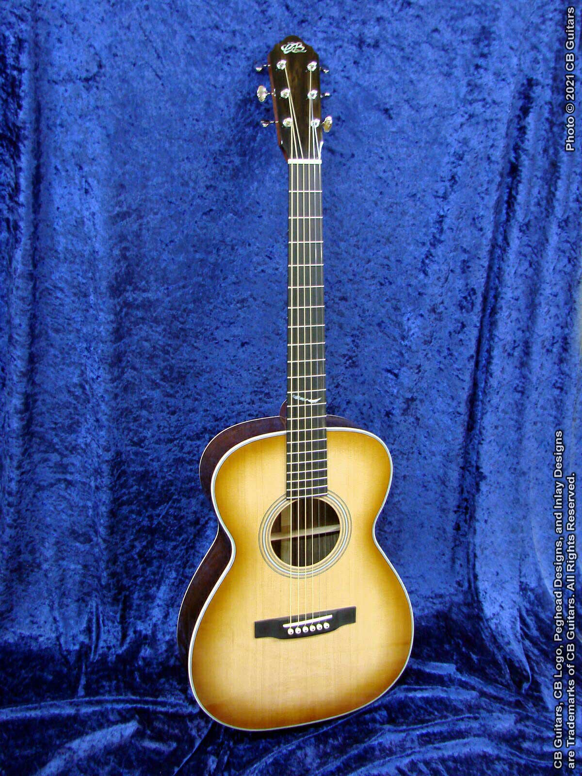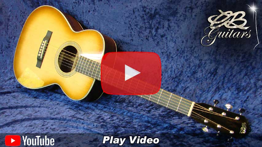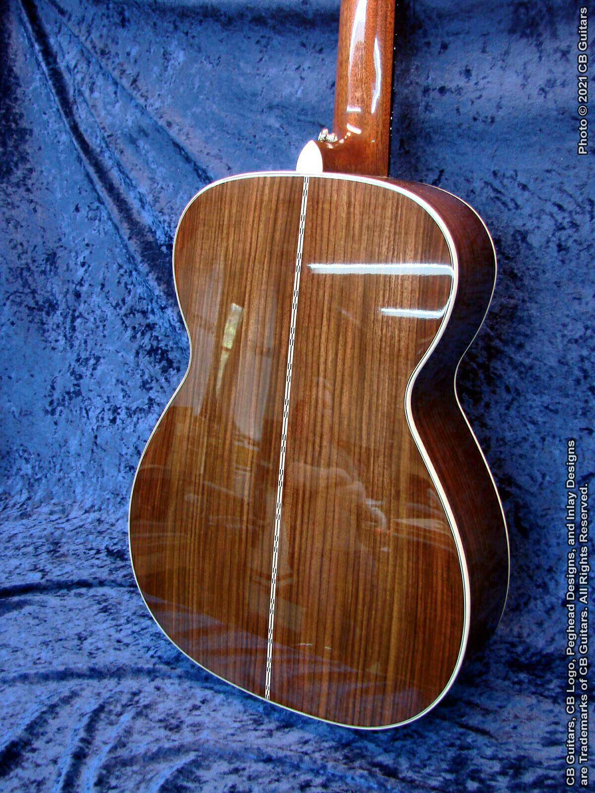 Top: Solid Sitka spruce, tap-tuned with forward-shifted hand-scalloped braces. Top Finish: Custom "Teaburst". Top Binding: Multiple grained ivoroid. Back & Sides: Solid East Indian Rosewood with "Checkerboard" back strip. Back Binding: Multiple grained ivoroid. Neck: Honduran Mahogany with diamond volute. Peghead: Ebony overlay with CB logo in Mother-of-Pearl. Tuning Machines: Nickel-plated Waverly vintage-style open-back with "butterbean" buttons. Fretboard: Ebony with Custom "Lake Chautauqua, New York" inlay and natural bone nut. Bridge: Ebony with natural bone saddle. Price (as shown): $4,250.00