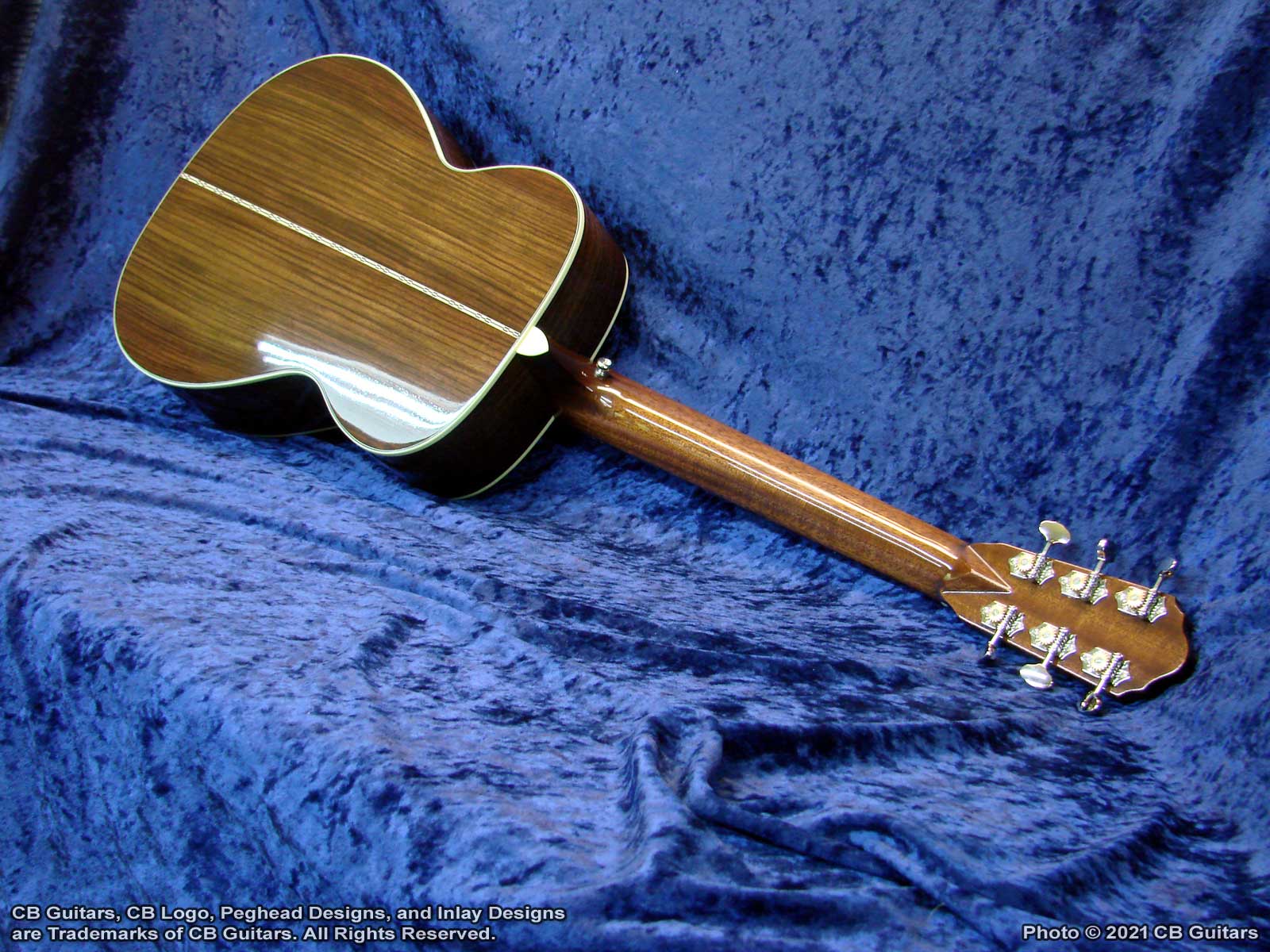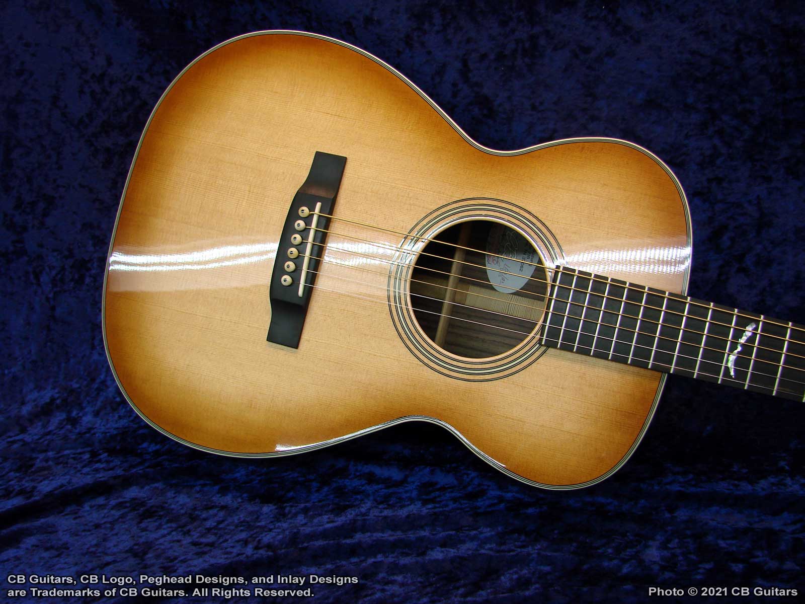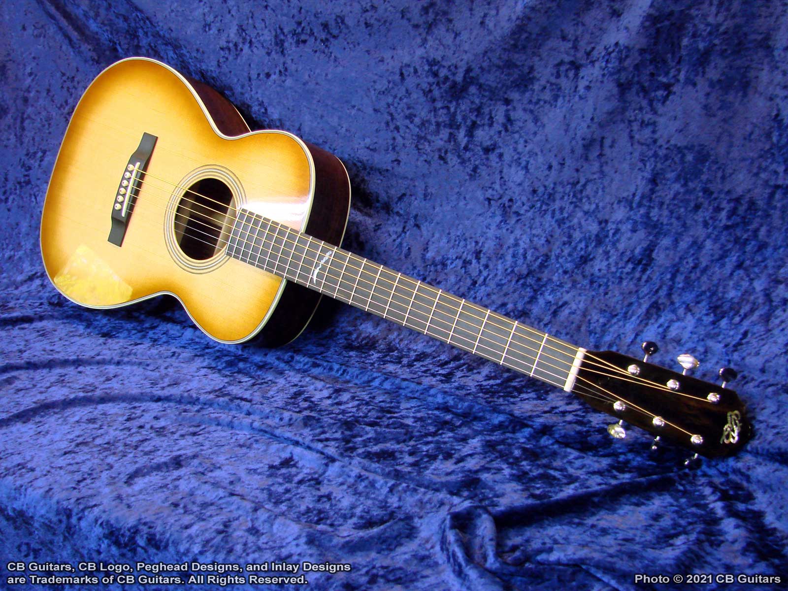 Top: Solid Sitka spruce, tap-tuned with forward-shifted hand-scalloped braces. Top Finish: Custom "Teaburst". Top Binding: Multiple grained ivoroid. Back & Sides: Solid East Indian Rosewood with "Checkerboard" back strip. Back Binding: Multiple grained ivoroid. Neck: Honduran Mahogany with diamond volute. Peghead: Ebony overlay with CB logo in Mother-of-Pearl. Tuning Machines: Nickel-plated Waverly vintage-style open-back with "butterbean" buttons. Fretboard: Ebony with Custom "Lake Chautauqua, New York" inlay and natural bone nut. Bridge: Ebony with natural bone saddle. Price (as shown): $4,250.00