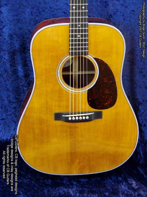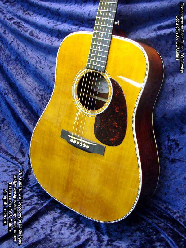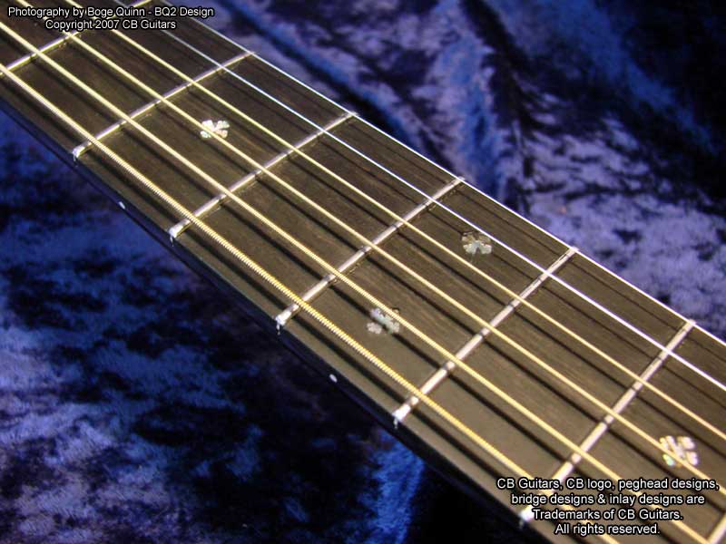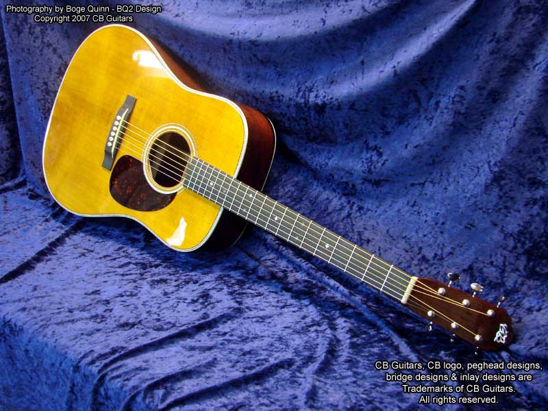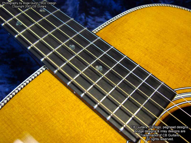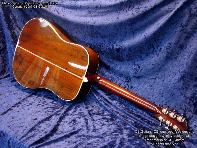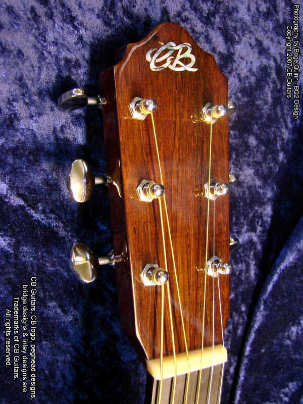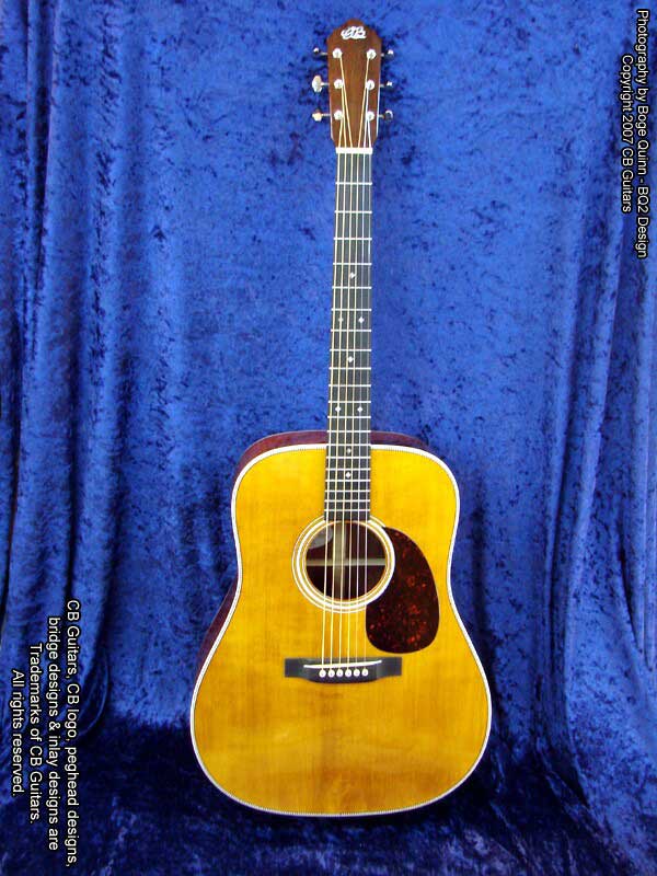 Top: Adirondack "Red" spruce, tap-tuned with hand-scalloped braces. Top Finish: Antique Natural. Top Binding: Grained ivoroid with "Herringbone" purfling. Back & Sides: Select-grade Brazilian Rosewood. Back Binding: Grained ivoroid with inner purfling. Neck: Mahogany with diamond volute. Peghead: Chris' trademark "Vintage" peghead shape with Brazilian Rosewood overlay & abalone CB logo. Tuning Machines: Nickel-plated Waverly vintage-style open-back with "butterbean" buttons. Fretboard: Ebony with "CB Snowflake" inlays. Bridge: Ebony with vintage-style "long" bone saddle & bone bridge pins.