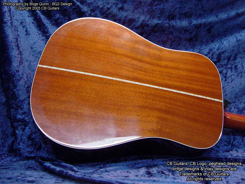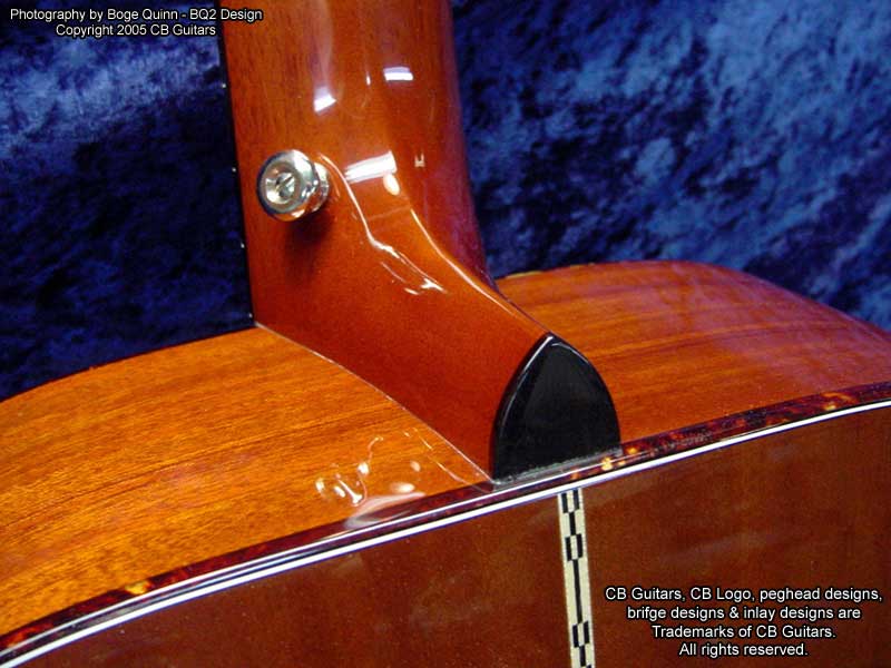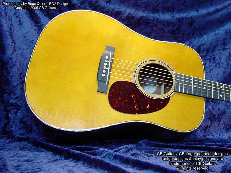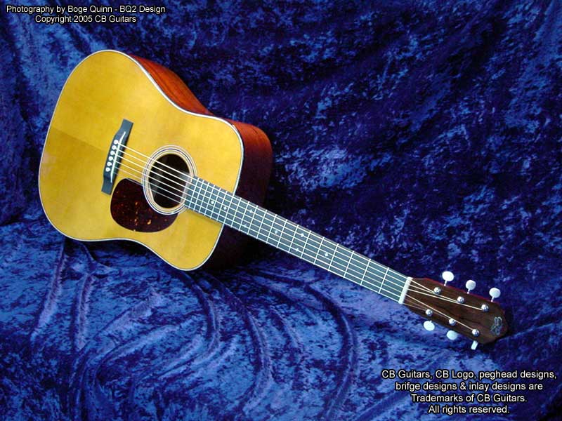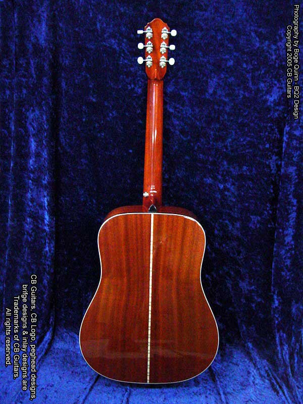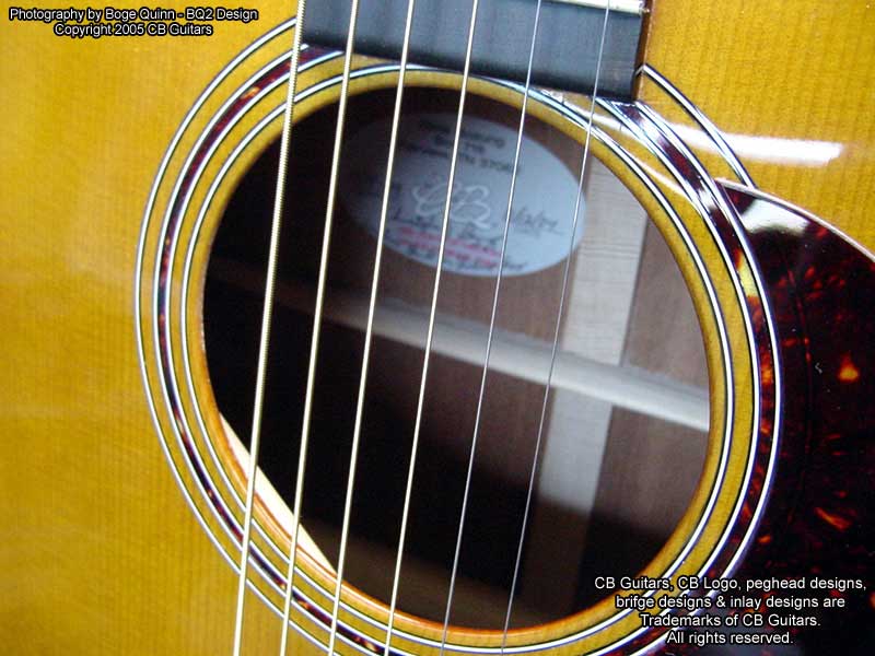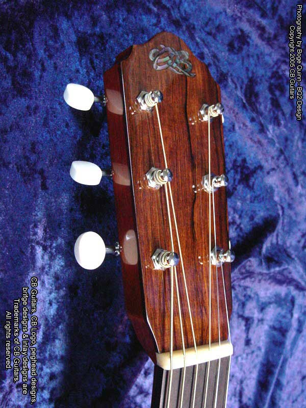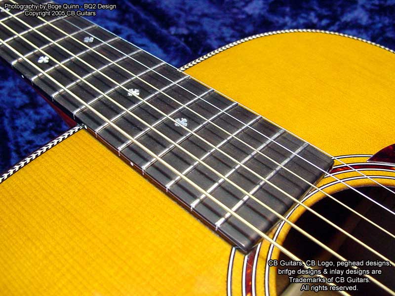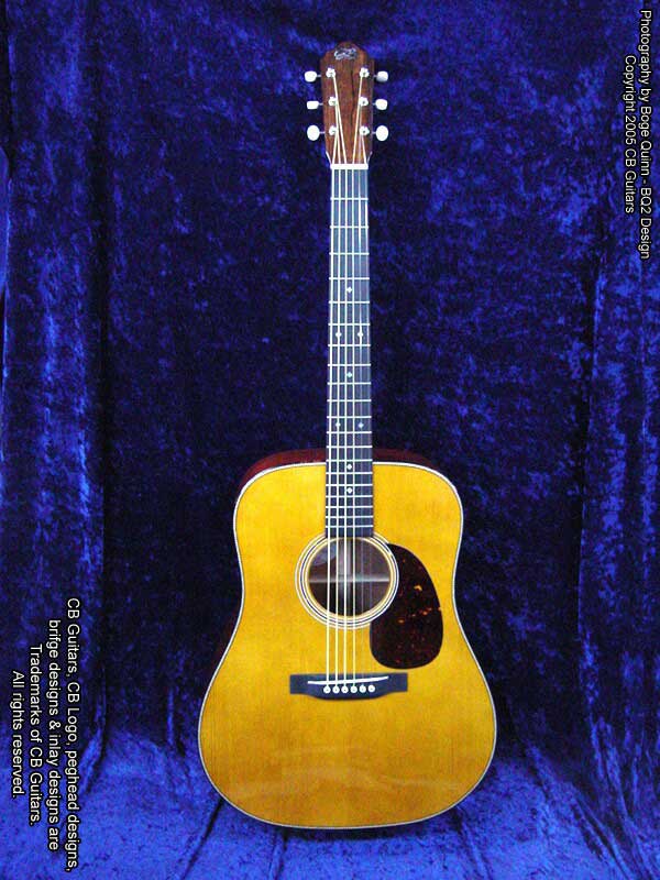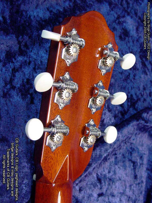 Top: Adirondack "Red" Spruce. Top Finish: Antique Natural. Top Binding: Tortoise ivoroid with "Herringbone" purfling. Back & Sides: Select-grade Honduras Mahogany. Back Binding: Tortoise ivoroid with inner purfling. Neck: Mahogany with diamond volute. Peghead: Chris' trademark "Vintage" peghead shape with Cocobolo overlay & abalone CB logo. Tuning Machines: Nickel-plated Grover vintage-style open-back with oval ivoroid buttons. Fretboard: Ebony with "CB Snowflake" inlays. Bridge: Ebony with vintage-style "long" saddle.